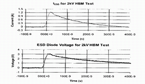 大電流在ESD二極管和引線上產生I-R壓降,該電壓高於二極管本身的壓降。IC可靠性報告中給出了器件設計所能承受的ESD測試電壓。