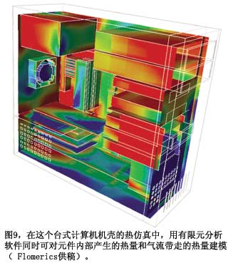 美國國家半導體的Webench在線設計工具采用Flomerics的Flotherm熱re分fen析xi軟ruan件jian,計ji算suan靜jing止zhi空kong氣qi中zhong的de器qi件jian溫wen度du。所suo有you一yi般ban的de仿fang真zhen注zhu意yi事shi項xiang均jun適shi用yong。如ru果guo你ni的de電dian路lu有you風feng扇shan和he一yi些xie氣qi流liu,其qi溫wen升sheng就jiu較jiao低di。如ru果guo有you機ji箱xiang,裏li麵mian還hai有you其qi它ta器qi件jian,其qi溫wen升sheng就jiu高gao。Flomerics采用有限元方案技術(參考文獻5)。圖9顯示了一個計算機機殼發熱與氣流的分析結果。很多其它有限元解算器也可以分析這種問題。例如,Comsol的一個解算器可以完成多重物理分析,可以解算超過一個問題的偏微分方程,如一隻部件的熱響應,部件的導熱性能隨其溫度而變化。TI的Edwards指出,他的公司提供二種級別的熱建模抽象:ΦJB熱阻,以及Delphi緊湊模型標準。Flotherm、Icepak和很多其它熱分析程序都使用這些模型。