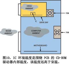 無疑,當大多數工程師沒有理解環境溫度的嵌套程度時,他們就會失敗。例如,假設要設計一個部件,用於CD播放機的光學拾取裝置(圖10)。你可能會這麼假設,由於該部件用於消費產品,它可能工作在0℃~70℃。但好好想想吧。實驗室工作台上的部件可能是工作在25℃環境下。而光功率件是要安裝在CD驅(qu)動(dong)器(qi)裏(li),驅(qu)動(dong)器(qi)中(zhong)有(you)其(qi)它(ta)元(yuan)件(jian)在(zai)加(jia)熱(re)空(kong)氣(qi),該(gai)裝(zhuang)置(zhi)可(ke)能(neng)不(bu)裝(zhuang)風(feng)扇(shan)。更(geng)糟(zao)糕(gao)的(de)是(shi),播(bo)放(fang)機(ji)裝(zhuang)在(zai)計(ji)算(suan)機(ji)內(nei),驅(qu)動(dong)器(qi)必(bi)須(xu)工(gong)作(zuo)在(zai)這(zhe)種(zhong)環(huan)境(jing)溫(wen)度(du)下(xia)。計(ji)算(suan)機(ji)內(nei)部(bu)有(you)自(zi)己(ji)的(de)熱(re)源(yuan)和(he)風(feng)扇(shan),這(zhe)個(ge)溫(wen)度(du)上(shang)再(zai)加(jia)上(shang)外(wai)部(bu)環(huan)境(jing)溫(wen)度(du),因(yin)此(ci),在(zai)工(gong)作(zuo)台(tai)上(shang)測(ce)得(de)的(de)25℃室溫,到了計算機內就是40℃,CD驅動器內是50℃。現在,如果你把計算機放在厄瓜多爾的一個很熱的閣樓上,情況又該如何?這個部件必須工作在遠高於70℃的環境溫度下。你的職責是確保它仍能滿足規範,並且高溫不會顯著縮短產品的壽命。