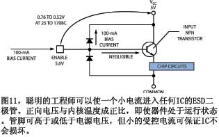 同樣,如果多餘管腳是片選腳,它必須在IC工作時保持為低電平,則可以將該腳拉低到接地腳,並從ESD二極管獲得數據。如果該腳是輸出腳,則要與製造商聯絡,以確認沒有外部電流會妨礙全部100mA電流穿過二極管。你必須對每種IC測量這個數據,不同工藝有不同的電壓/過溫關係。當你準備對電路中運行IC作測量時,在管腳注入100mA使其升至VCC以上,或從該腳拉出100mA,將其降到接地以下。然後,就可以測量電壓差,並推算內核的溫度。