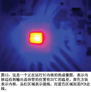 有關ESD二極管方法的另一個擔心是,IC芯片並不是等溫的,即它們在空間和時間上都不具備相等或恒定溫度。測量ESD二極管時並不能永遠保證測到的是內核的最熱點。這裏關注的是ESD二極管,它總是在芯片的邊沿,低於輸出晶體管的溫度。你可以獲得IC工作時的IR熱成像圖(圖12)。圖中明亮的白點比ESD二極管所在的內核邊沿高25℃。當器件工作在高溫下時,可能需要降級使用(參考文獻8)。在150℃時,器件可能不能滿足電路的要求。