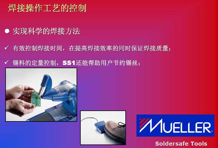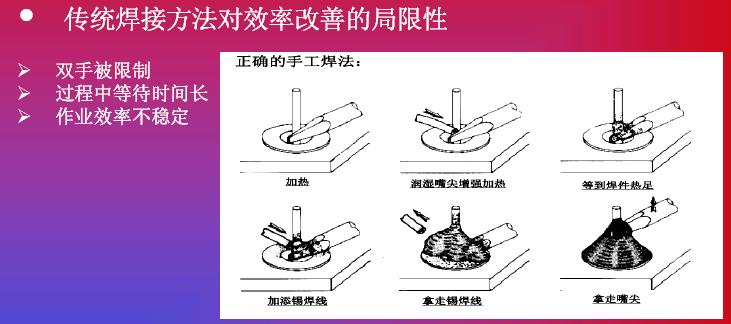 在發熱功率方麵的提高,我們碰到另外一個問題。我們也可以看到951和937,還(hai)有(you)新(xin)推(tui)出(chu)來(lai)機(ji)器(qi),我(wo)們(men)將(jiang)發(fa)熱(re)功(gong)率(lv)進(jin)行(xing)對(dui)比(bi)。他(ta)們(men)也(ye)花(hua)了(le)很(hen)多(duo)研(yan)發(fa)精(jing)力(li)來(lai)提(ti)高(gao)發(fa)熱(re)功(gong)率(lv),如(ru)果(guo)在(zai)提(ti)高(gao)發(fa)熱(re)功(gong)率(lv)之(zhi)後(hou),確(que)實(shi)能(neng)提(ti)高(gao)生(sheng)產(chan)效(xiao)率(lv),但(dan)是(shi)它(ta)是(shi)不(bu)是(shi)可(ke)以(yi)被(bei)無(wu)限(xian)製(zhi)提(ti)升(sheng)呢(ne)?現(xian)在(zai)的(de)機(ji)器(qi)比(bi)如(ru)到(dao)150瓦到160瓦,已經上升了3倍,是否還會提高到4倍,這一個效率的提高導致整體效率的提高,我個人不是很讚同。其實這是比較係統性的解決方案,我們看到MUELLER是shi通tong過guo對dui工gong藝yi改gai進jin達da到dao更geng高gao的de焊han接jie效xiao率lv。在zai談tan到dao這zhe款kuan機ji器qi之zhi前qian,我wo們men回hui顧gu一yi下xia傳chuan統tong焊han接jie方fang法fa作zuo業ye的de特te點dian,我wo們men的de圖tu從cong左zuo到dao右you看kan,整zheng個ge工gong藝yi從cong加jia熱re到dao預yu熱re,再zai繼ji續xu加jia熱re,第di四si步bu是shi添tian加jia焊han心xin,然ran後hou取qu走zou焊han嘴zui,這zhe是shi非fei常chang傳chuan統tong的de焊han接jie工gong藝yi,反fan過guo來lai看kan,我wo們men看kan到dao整zheng個ge焊han接jie過guo程cheng中zhong,雙shuang手shou是shi被bei限xian製zhi的de。從cong第di二er張zhang圖tu開kai始shi,都dou是shi靠kao手shou去qu拿na,關guan鍵jian是shi控kong製zhi在zai雙shuang手shou被bei占zhan用yong。過guo程cheng等deng待dai時shi間jian會hui很hen長chang,我wo們men可ke以yi看kan到dao實shi際ji作zuo業ye過guo程cheng中zhong下xia麵mian三san步bu是shi真zhen正zheng起qi到dao作zuo用yong,前qian麵mian預yu熱re當dang然ran是shi準zhun備bei工gong作zuo,但dan是shi在zai這zhe個ge工gong作zuo中zhong,我wo們men雙shuang手shou等deng待dai的de時shi間jian會hui非fei常chang長chang。第di三san個ge,作zuo業ye效xiao率lv不bu是shi特te別bie穩wen定ding,因yin為wei我wo們men送song錫xi的de時shi候hou,以yi及ji拿na走zou錫xi絲si過guo程cheng中zhong依yi賴lai員yuan工gong本ben身shen的de技ji巧qiao和he技ji術shu。