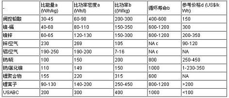 注:NA-數據不詳、a-C/3放電率、b-80%DOD、c-機械重充電、d-僅供參考、USABC-美國先進蓄電池協作體。