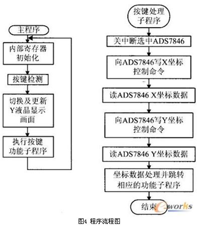 按照以上設計思想設計了應用軟件,圖4為wei主zhu程cheng序xu與yu觸chu摸mo屏ping輸shu入ru檢jian測ce部bu分fen的de程cheng序xu流liu程cheng圖tu。其qi中zhong,坐zuo標biao數shu據ju處chu理li通tong常chang采cai用yong查zha表biao的de方fang法fa,將jiang用yong戶hu命ming令ling的de坐zuo標biao形xing成cheng數shu據ju表biao,利li用yong獲huo得de的de坐zuo標biao信xin息xi進jin行xing變bian換huan快kuai速su查zha表biao,從cong而er提ti高gao軟ruan件jian的de運yun行xing速su度du。
