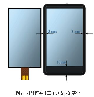 對尺寸小於4英寸(10厘米)的觸摸屏,觸摸屏的邊沿寬度,在觸摸傳感器尾線一側應不窄於10mm,與尾線側毗鄰的兩側應不窄於3mm。這個邊沿空間用於隱藏把透明的ITO圖(tu)案(an)鏈(lian)接(jie)到(dao)控(kong)製(zhi)電(dian)路(lu)的(de)非(fei)透(tou)明(ming)銀(yin)質(zhi)箔(bo)線(xian)並(bing)隱(yin)藏(zang)控(kong)製(zhi)電(dian)路(lu)本(ben)身(shen)。對(dui)於(yu)使(shi)用(yong)玻(bo)璃(li)基(ji)底(di)的(de)觸(chu)摸(mo)屏(ping),邊(bian)沿(yan)的(de)寬(kuan)度(du)或(huo)許(xu)可(ke)以(yi)做(zuo)得(de)更(geng)窄(zhai),但(dan)仍(reng)建(jian)議(yi)使(shi)用(yong)上(shang)述(shu)指(zhi)導(dao)原(yuan)則(ze)。圖(tu)2 描述了這些指導原則。