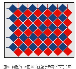 在完成了機械評估之後,必須為觸摸屏選擇一個合適的基底。圖3 顯示了投射式電容觸摸屏的一個典型ITO圖案。