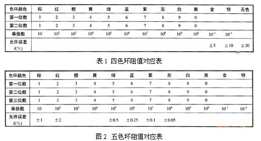 xianzaichangyongdegudingdianzudouyongsehuanfalaibiaoshitadebiaochengzuzhihewucha。sehuanfajiushiyongyansebiaoshiyuanjiandebiaochengzuzhihewucha,bingzhijiebiaozhizaichanpinshangdeyizhongfangfa。changjiandesehuandianzuyousihuanhewuhuandianzuliangzhong(其中五環電阻屬於精密電阻)。一般由四道色環或五道色環來表示其標稱阻值和誤差,各種顏色代表不同的數值,色環顏色所代表的數字或意義如表1和表2所示。