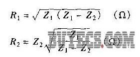 式中,Z1和Z2為網絡1和網絡2的阻抗,它們分別為300Ω和75Ω。將它們代入上麵兩個公式中,則求得RI=259.8Ω,R2=86.6Ω。