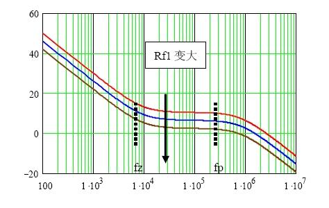 因此,當補償網絡進入係統環路之後,Rf1的作用是使環路增益的幅頻特性上下平移,同時環路增益的相頻特性保持不變。