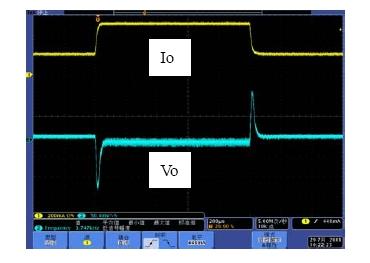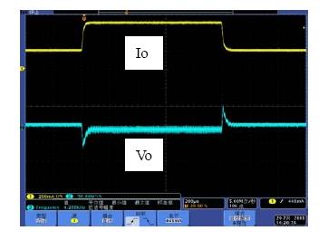 係統的帶寬是影響係統動態響應的重要因素,相位裕度是影響係統穩定性的重要因素。如果選擇不同的Rf1,係統的帶寬和相位裕度會產生變化,也就是動態響應和穩定性會發生變化。具體以表1來分析,當Rf1從300k變到750k,係統地帶寬從51.1kHz變到26.1kHz,因此係統的動態響應會相應的變差,而由於相位裕度都是足夠的,因此係統都處於穩定工作的狀態。圖7和圖8是做負載切換的動態響應測試結果,從測試結果可以看出環路響應速度變慢,導致輸出電壓過衝變大,動態響應效果變差。