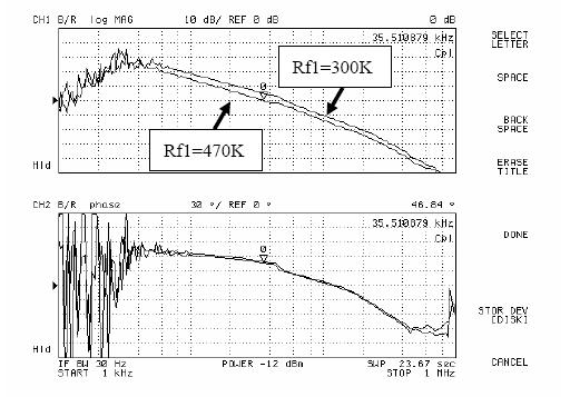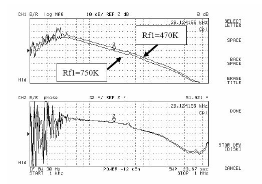 圖5和圖6是用網絡分析儀進行AP3406環路增益測試的結果。由圖可以看出,當Rf1從300k變化到470k,再變化到750k,係統的環路增益的幅頻特性不斷向下移動,同時相頻特性基本不變。於是係統的帶寬和相位裕度都有較大改變,測試結果如表1所示。