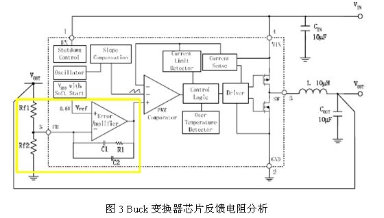 Buck變換器由於具有效率高的優點而被廣泛應用於手機、GPS、MP3等移動多媒體設備上,目前很多電源管理芯片製造廠商都推出了不同電流能力的Buck變換器,這類變 換器雖然在電流能力和保護功能方麵存在一些差異,但是他們電路的主框架結構是基本一致的,主要可以分為兩個部分:一是實現電能轉換的主功率部分,另一部分 是實現負反饋控製的控製電路。下圖是BCD半導體公司的Buck變換器AP3406的典型應用圖,黃色框裏是對反饋電阻的作用做簡要分析。