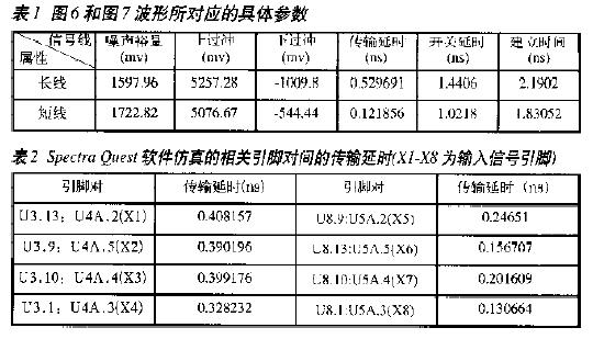 jianceqidemeigexinhaoyingjinkenengbaochitongyichuanshuyanchi,zhejiuyaoqiubuxianshijinliangbaochichangduyizhi,duiyuweiruodechabie,keyigenjufangzhenjieguoyanchanghuosuoduanbuxian。wanchengbuxianyihou,zailiyongSpectra Quest軟件仿真輸入信號的傳輸延遲,具體參數如表2所示。可以看出,其相對延時不超過0.2ns,仿真結果比較理想。
