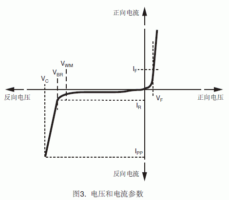 斷態電壓指的是TVS在未擊穿情況下所能承受的最高電壓,它是在正常情況下不工作電路中保護器件的重要參數。在汽車中,一些汽車電子產品規範是根據“跳線跨接起動保護”的情況製定的。這種情況要求為12V類型電子設備提供10分鍾24VDC,或為24V類型電子設備提供10分鍾36VDC,而不損壞電路或者引起電路故障。因此,斷態電壓是汽車電子產品中TVS的一項關鍵參數。