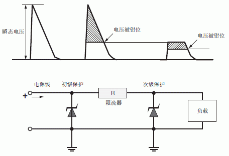 在電源線上增加電阻R可以減小瞬態電流,這樣就可以使用更小額定功率的TVS作為次級保護。電子單元中的微控製器和邏輯電路需要的電流為150mA~300mA,在-18℃下12V電池的最小輸出電壓為7.2V,同樣條件下,24V電池的最小輸出電壓為14.4V。同樣條件的24V電池中,在300mA負載、R=20Ω的條件下電源電壓為8.4V,在R=10Ω和14.4V的最低電壓(24V電池在-18℃時的電壓)條件下為11.4V。計算公式為:VL=(Vmin/(Vmin/IL))×((Vmin/IL)–R),其中,VL為負載電壓,Vmin為最小輸入電壓,IL為負載電流,R為電阻阻值,R的額定功率=I2R。