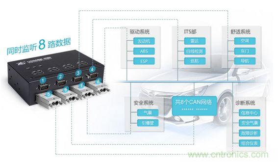 若(ruo)將(jiang)每(mei)個(ge)節(jie)點(dian)單(dan)獨(du)取(qu)出(chu)做(zuo)測(ce)試(shi),則(ze)必(bi)然(ran)破(po)壞(huai)原(yuan)有(you)通(tong)信(xin)規(gui)則(ze)。如(ru)何(he)在(zai)不(bu)破(po)壞(huai)原(yuan)有(you)通(tong)信(xin)的(de)基(ji)礎(chu)上(shang)搞(gao)清(qing)楚(chu)一(yi)個(ge)陌(mo)生(sheng)的(de)收(shou)發(fa)協(xie)議(yi)呢(ne)?所(suo)謂(wei)工(gong)欲(yu)善(shan)其(qi)事(shi),必(bi)先(xian)利(li)其(qi)器(qi)。您(nin)需(xu)要(yao)一(yi)個(ge)能(neng)同(tong)時(shi)收(shou)發(fa)、轉送多路CAN數據的CAN卡,USBCAN-8E-U正是為這種應用而生。