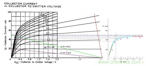 圖中假定電源電壓為4V,綠色的斜線是負載電阻為80歐姆的負載線,V/R=50MA,圖中標出了Ib分別等於0.1、0.2、0.3、0.4、0.6、1.0mA的工作點A、B、C、D、E、F。據此在右側作出了Ic與Ib的關係曲線。根據這個曲線,就比較清楚地看出“飽和”的含義了。曲線的綠色段是線性放大區,Ic隨Ib的增大幾乎成線性地快速上升,可以看出β值約為200。蘭色段開始變彎曲,斜率逐漸變小。紅色段就幾乎變成水平了,這就是“飽和”。實際上,飽和是一個漸變的過程,蘭色段也可以認為是初始進入飽和的區段。在實際工作中,常用Ib*β=V/R作為判斷臨界飽和的條件。在圖中就是假想綠色段繼續向上延伸,與Ic=50MA的水平線相交,交點對應的Ib值就是臨界飽和的Ib值。圖中可見該值約為0.25mA。