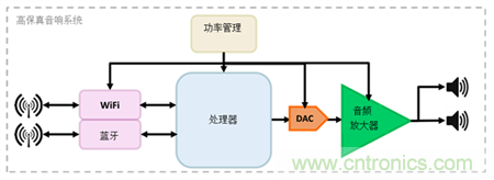 處理器執行各種音頻處理功能,如解碼和信號均衡,同時也處理Wi-Fi和/或藍牙通信軟件堆棧。過去,CD品質的采樣頻率可能已足夠。但是今天的高保真音頻係統對信號鏈中的處理器提出了其它要求,因為高保真音質要求在24位音樂信號流中提供48kHz至192kHz範圍內的采樣率。