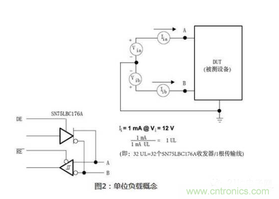 圖2給出了SN75LBC176A收發器單位負載計算的例子。因為這款設備將驅動器和接收器集成到一起構成了收發器(即驅動器輸出和接收器輸入連接到了同一根總線上),因此很難分別獲取驅動器泄漏電流和接收器輸入電流。為了便於計算,將接收器輸入阻抗看作12 kΩ並給收發器1mA電流。這可以代表一個單位負載,一跟傳輸總線上允許32個這樣的負載。