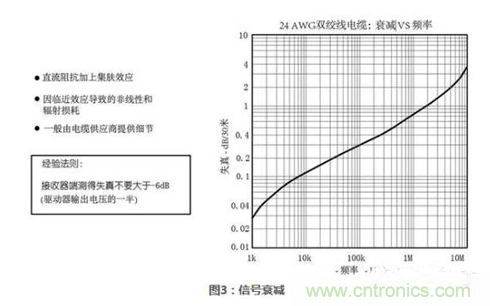 2.2信號衰減和失真一個有用的常識是:在最大信號速率(單位:Hz)通訊的條件下,允許信號衰減-6dB。一般情況下,電纜供應商會提供信號衰減圖表。圖3所示的曲線顯示了24-AWG電纜衰減和頻率的關係。