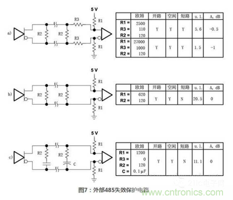 使用這樣的內部上下拉電阻允許總線不進行終端匹配,但是會顯著的降低最大信號速率和可靠性。圖7給出了一些485接口通用外置失效保護電路,每個電路都盡力維持接收器輸入端電壓不小於最小臨界值並在一個或多個故障條件(開路、空閑、短路)下,維持一個已知的邏輯狀態。
