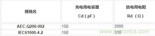 HBM的ESD測試規格有AEC-Q200-002和IEC61000-4-2等,HBM模型常熟如下表所示因規格有所不同。