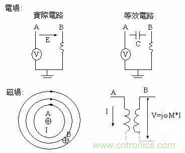 就Maxwell方程式的大多數應用而言,噪聲耦合方法可以代表等效組件的模型。例如:在兩個導體之間的一個時變電場,可以代表一個電容。在相同的兩導體之間,一個時變磁場可以代表互感(mutual inductance)。附圖二表示這兩種噪聲耦合機製。