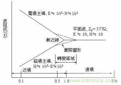 近場(near field)(磁和電的成份)和遠場的關係,如附圖一所示。所有的波都是磁場和電場成份的組合。這種組合稱作「PoynTIng向量」。實(shi)際(ji)上(shang),是(shi)沒(mei)有(you)一(yi)個(ge)單(dan)獨(du)的(de)電(dian)波(bo)或(huo)磁(ci)波(bo)存(cun)在(zai)的(de)。我(wo)們(men)之(zhi)所(suo)以(yi)能(neng)夠(gou)測(ce)量(liang)到(dao)平(ping)麵(mian)波(bo),是(shi)因(yin)為(wei)對(dui)一(yi)個(ge)小(xiao)天(tian)線(xian)而(er)言(yan),在(zai)距(ju)離(li)來(lai)源(yuan)端(duan)數(shu)個(ge)波(bo)長(chang)的(de)地(di)方(fang),其(qi)波(bo)前(qian)(wavefront)看起來像平麵一樣。