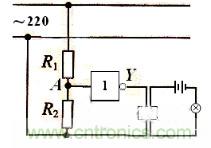 在商場、圖(tu)書(shu)館(guan)等(deng)公(gong)共(gong)場(chang)所(suo)都(dou)有(you)消(xiao)防(fang)應(ying)急(ji)燈(deng),為(wei)出(chu)現(xian)火(huo)災(zai)時(shi),電(dian)源(yuan)被(bei)切(qie)斷(duan)的(de)情(qing)況(kuang)下(xia)提(ti)供(gong)逃(tao)生(sheng)的(de)照(zhao)明(ming)電(dian)器(qi)。如(ru)圖(tu)所(suo)示(shi)為(wei)消(xiao)防(fang)應(ying)急(ji)燈(deng)的(de)原(yuan)理(li)圖(tu),當(dang)情(qing)況(kuang)正(zheng)常(chang)時(shi)R2兩端處於高電壓狀態,則在A點輸入高電平(即輸入為邏輯1),通過非門後,Y輸出為低電平(即輸出邏輯為0),所以繼電器J處於斷開狀態,應急燈不亮;當電源被切斷時,A點為低電平(即輸入為邏輯0),通過非門後,Y輸出為高電平(即輸入為邏輯1),繼電器接通,應急燈亮。