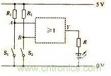 汽車給人們的出行帶來方便、舒適,但其安全性也很重要。如圖所示為簡單的車門報警電路圖。圖中的兩個按鈕開關S1、S2分別裝在汽車的兩道門上。駕駛員離開汽車時,兩車門均處於關閉狀態,跟兩車門對應的開關S1、S2均閉合,即輸入邏輯均為0,那麼輸出也是邏輯0,電流不通過發光二極管,這時發光二極管不會發光報警;隻要其中任何一個車門打開時,S1或S2就處於斷開狀態,即輸入為邏輯1,那麼輸出也是邏輯1,這時就有電流通過發光二極管,使其發光報警。如果有四個門,原理也是一樣,通過指示燈發光報警就可以判斷門是否都關好了。