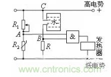許多家庭都安裝了電熱水器,它給人們的生活帶來了方便。如圖所示是電熱水器係統的恒溫器集成電路。R1為調溫電阻,R2為熱敏電阻。“與”門電路的兩個輸入端分別接上一個水位傳感器和一個水溫傳感器。當水箱充滿水時,B點為高電壓(即輸入為邏輯1),R2為熱敏電阻,溫度越低,熱敏電阻的阻值越大,兩端的分壓越大,當電壓達到一定程度時,A點為高電壓(即輸入為邏輯1),當A和B都為高電壓時,“與”門的輸出端為高電壓,電熱水器的加熱開關才會接通電源,對水箱中的水進行加熱。當溫度高於一定溫度時,R2的電阻變小,R2兩端的電壓變小,發熱器停止加熱,所以熱水器處於保溫狀態。當水箱水不滿時,或者溫度高時發熱器都不會加熱。