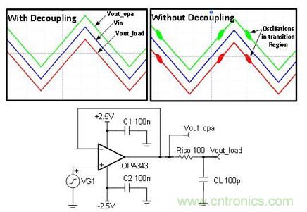 圖 1 為帶去耦電容器和不帶去耦電容器(C1 和C2)情況下用於驅動 R-C 負載的緩衝電路。我們注意到,在不使用去耦電容器的情況下,電路的輸出信號包含高頻 (3.8MHz) 振蕩。對於沒有去耦電容器的放大器而言,通常會出現穩定性低、瞬態響應差、啟動出現故障以及其它多種異常問題。