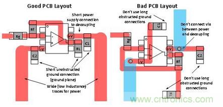 圖 3 將jiang良liang好hao的de去qu耦ou合he板ban麵mian布bu局ju與yu糟zao糕gao的de布bu局ju進jin行xing了le對dui比bi。您nin應ying始shi終zhong嚐chang試shi著zhe讓rang去qu耦ou合he連lian接jie保bao持chi較jiao短duan的de距ju離li,同tong時shi避bi免mian在zai去qu耦ou合he路lu徑jing中zhong出chu現xian通tong孔kong,原yuan因yin是shi通tong孔kong會hui增zeng加jia電dian感gan。大da部bu分fen產chan品pin說shuo明ming書shu都dou會hui給gei出chu去qu耦ou合he電dian容rong器qi的de推tui薦jian值zhi。如ru果guo沒mei有you給gei出chu,則ze可ke以yi使shi用yong 0.1uF。