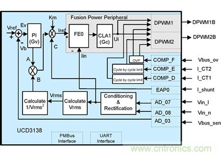 您可以看到固件外部仍有可使用示波器進行監控的模擬信號。另外,您是否注意到方框底部輸出的信號?這些信號將進入 UCD3138 數字控製器並由固件處理,請看下圖。