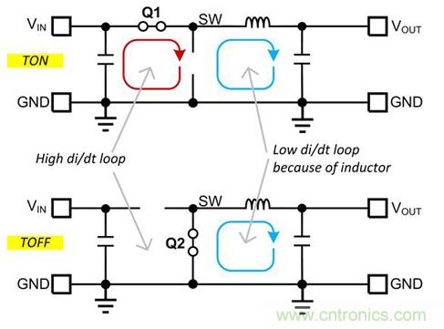 圖 1. 降壓轉換器中的電流環路。VIN 環路為高 di/dt 環路。