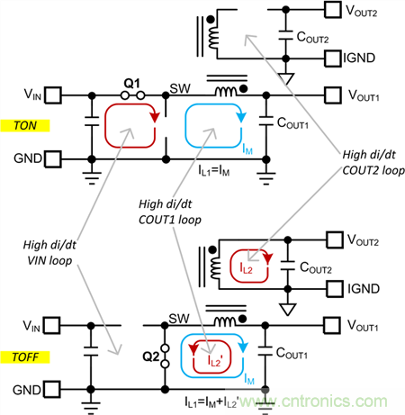 Fly-Buck 轉換器的一次側看上去與降壓轉換器類似,如圖 2 所示。這裏的 VIN 環路與降壓轉換器一樣,也是高 di/dt 環路。然而,VOUT1 環(huan)路(lu)的(de)電(dian)流(liu)與(yu)降(jiang)壓(ya)轉(zhuan)換(huan)器(qi)有(you)很(hen)大(da)不(bu)同(tong)。除(chu)了(le)一(yi)次(ci)電(dian)感(gan)器(qi)磁(ci)化(hua)電(dian)流(liu)外(wai),該(gai)環(huan)路(lu)還(hai)包(bao)含(han)來(lai)自(zi)二(er)次(ci)繞(rao)組(zu)的(de)反(fan)射(she)電(dian)流(liu)。反(fan)射(she)電(dian)流(liu)隻(zhi)含(han)有(you)其(qi)路(lu)徑(jing)中(zhong)耦(ou)合(he)電(dian)感(gan)器(qi)的(de)漏(lou)電(dian)感(gan),因(yin)此(ci) di/dt 明顯高於電感器磁化電流。所以盡量減小 VOUT1 環路的環路麵積也非常重要。同樣的道理,包含二次電感器繞組、整流器二極管以及二次輸出電容器的二次輸出環路也需要最小化,因為裏麵有高 di/dt 電流流過。