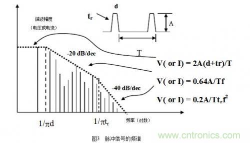 在EMC中zhong,除chu了le基ji本ben頻pin率lv外wai,還hai需xu考kao慮lv諧xie波bo因yin素su,通tong常chang取qu十shi倍bei頻pin,但dan在zai數shu字zi電dian路lu中zhong卻que有you些xie不bu同tong,比bi如ru在zai時shi鍾zhong電dian路lu和he邏luo輯ji門men電dian路lu中zhong,輻fu射she帶dai寬kuan與yu數shu字zi信xin號hao的de上shang升sheng沿yan或huo下xia降jiang沿yan有you關guan係xi,而er不bu是shi數shu字zi信xin號hao的de重zhong複fu周zhou期qi,其qi關guan係xi為wei:rtF/1max,其中rt是脈衝的上升沿時間。例如,典型時鍾驅動的邊沿速率是2ns,此時,maxF≈160MHz,再考慮十倍頻,則此時鍾電路可能產生直到1.6GHzdefushedaikuan。suoyizaixuanzeqijianshiyaoxuanzemansudeluojiqijianxilie,yinweiqijianduidiancifushegongxiandedaxiaoyugongzuopinlvwuzhijieguanxierzhiqujueyubianyansulv(這和從電路功能設計上選擇快速器件是矛盾的,在電路設計時需要折中考慮)。還有從器件的抗擾能力上來說,CMOS器件是最好的,因為它的噪聲容限高。從封裝上來說,BGA是最好的,因為它的引線很短。脈衝信號的頻譜如圖3所示。