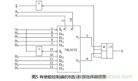 也可以添加使能控製端對所接成的8選1數據選擇器的工作狀態進行控製。添加使能控製端的8選1數據選擇器的電路如圖5所示。