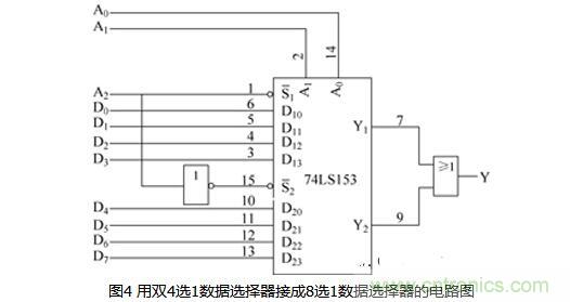 當A2=0時,上邊的4選1數據選擇器工作,根據地址輸入端A0、A1的狀態,輸出端Y1選擇輸出D0~D3,此時Y2=0,故Y=Y1;當A2=1時,下邊的4選1數據選擇器工作,根據地址輸入端A0、A1的狀態,輸出端Y2選擇輸出D4~D7,此時Y1=0,故Y=Y2。邏輯函數式為