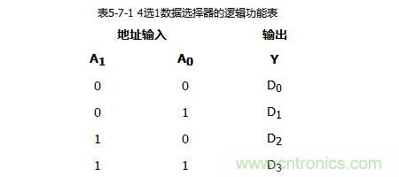 常用的多路選擇器有4選1、8選1、16選1等多種類型。下麵以4選1數據選擇器為例介紹數據選擇器的工作原理。根據前麵介紹的數據選擇器的功能,可以列出4選1數據選擇器的邏輯功能表,如表5-7-1所示。其中D0~D3為數據輸入端,A0、A1為數據選擇端。