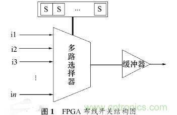在FPGA各種資源中,可編程邏輯塊是實現用戶功能的基本單元,每個可編程邏輯塊包含1個互連開關矩陣和4個SLICEs,其中每個SLICE包括2個查找表(Look-Up-Table,LUT)、2個觸發器和一些多路選擇器。互連開關矩陣主要由不同長度導線和多個布線開關組成,典型的布線開關結構如圖1所示。