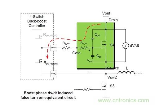 在4開關降壓-升壓轉換器中,dv/dt電感導通是由同步整流MOSFET在zai降jiang壓ya段duan和he升sheng壓ya段duan快kuai速su升sheng高gao的de漏lou源yuan電dian壓ya引yin起qi的de。由you於yu不bu需xu要yao的de擊ji穿chuan電dian流liu流liu過guo任ren一yi相xiang橋qiao臂bi,結jie果guo導dao致zhi整zheng個ge係xi統tong能neng效xiao下xia降jiang。電dian源yuan設she計ji人ren員yuan可ke采cai用yong幾ji種zhong經jing濟ji的de電dian路lu方fang案an,包bao括kuo最zui小xiao化hua整zheng流liu開kai關guan的de關guan斷duan門men極ji驅qu動dong電dian阻zu,增zeng加jia有you源yuan開kai關guan的de導dao通tong門men極ji驅qu動dong電dian阻zu,或huo在zai開kai關guan節jie點dian加jia入ruRC緩衝電路。選擇具有低Qgd/Qgs(th)比率和高閾值電壓的MOSFET也可降低dv/dt電感誤導通的可能性。