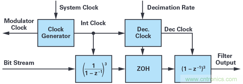 傳統的三階sinc濾波器如圖1所示。濾波器通過按比例縮放係統時鍾來生成ADC的調製器時鍾,而ADC則向濾波器返回一個1位數據流。濾波器功能本身包括三階級聯積分器 1/(1 – z–1)(時鍾速率與調製器速率相同)和三階級聯微分器 1 – z–1(時鍾速率為抽取時鍾)。