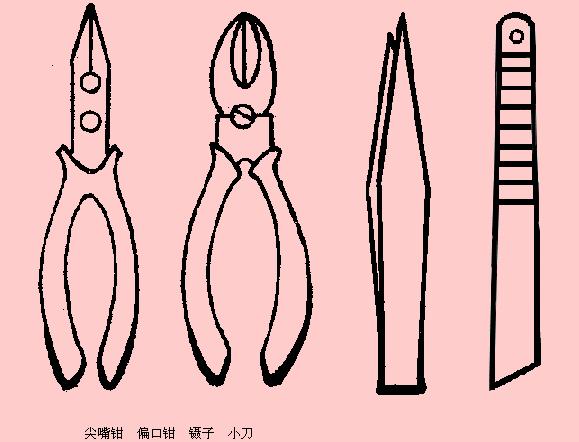 為了方便焊接操作常采用尖嘴鉗、偏口鉗、鑷子和小刀等做為輔助工具。同學們應學會正確使用這些工具。
