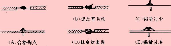 (A)所示應是錫點光亮,圓滑而無毛刺,錫量適中。錫和被焊物融合牢固。不應有虛焊和假焊。