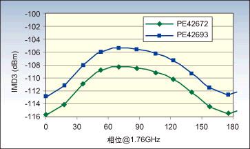 圖1:IP3與元件的第三階交調失真(IMD3)性能有關。該圖顯示了UltraCMOSSP7T(PE42672)和SP9T(PE42693)的這些相位上指標。