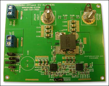 圖2. 原型電路板包含兩片MAX8686 PWM控製器和一組耦合線圈,每路輸出可提供1.2V、最大50A電流。