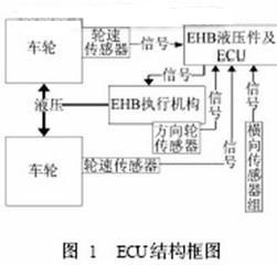 在中小型車輛的傳統製動係統中,駕駛員通過製動主缸在輪缸建立製動壓力,而EHB則是通過蓄能器提供製動壓力。蓄能器壓力由柱塞泵產生,可提供多次連續的製動壓力。EHB由傳感器、ECU及執行器(液壓控製單元)等構成,其結構如圖1所示。