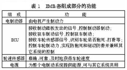 EMB主要用於小型車輛中,主要包含電製動器、ECU、輪速傳感器、動力電源等。它與EHB最大區別是製動力為電機提供的轉矩,而不是由柱塞泵產生的高壓油,且有獨立的電源來供電,其各部分的功能如表1。
