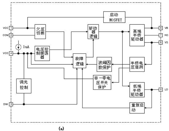 IRS2530D和IRS2158D為600V控製IC。IRS2530DDIM8是一種采用緊湊型8管腳尺寸半橋式驅動器的線性調光鎮流器控製IC。它隻需要幾個小型外部元件,顯著地簡化和縮小了電路設計,同時可實現10%的調光係統性能。圖3(a)為引腳功能示意圖。[page]